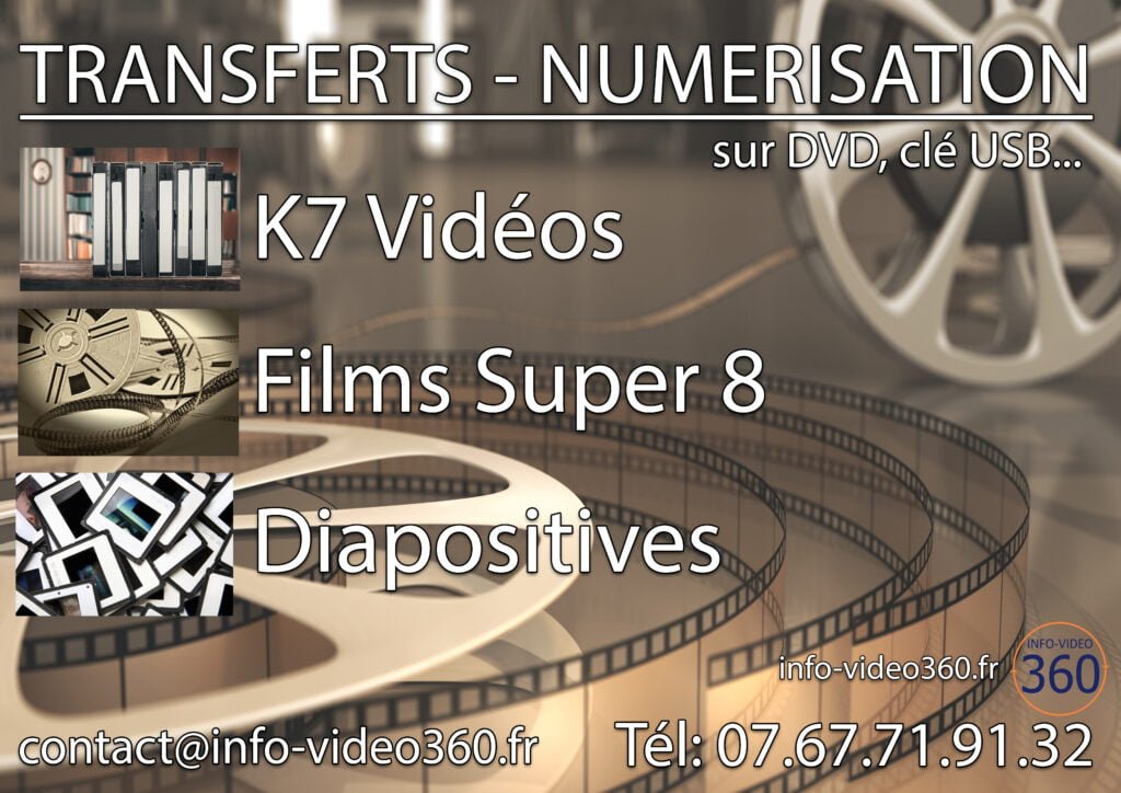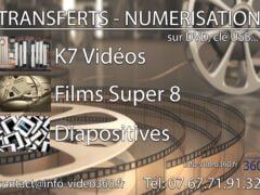 – Numérisation et transfert de films Super 8, K7 Vidéo (cassettes VHS, 8mm, Hi8, Digital 8, miniDv, HDV, dvCam), Diapos, Photos, Disques vinyle, K7 audio, transfert sur clé USB, disque dur, DVD, liens téléchargement.